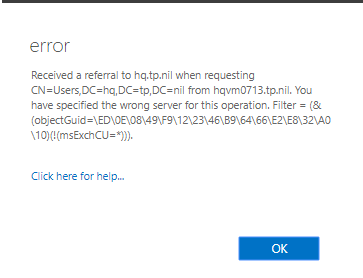 From the error, it seems like there is a problem with server configuration. From my research, the error message may occur if a wrong server has been specified for an operation that requires a specific server, such as Active Directory connectivity or role assignment. You may need to check your server settings and make sure they match the operation you are trying to perform.