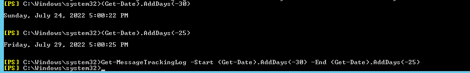 Get-MessageTrackingLog -Start (Get-Date).AddDays(-4) -End (Get-Date).AddDays(-1)- anhtntCopper Contributor