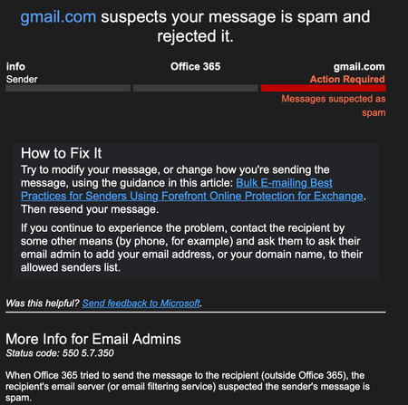 How to Fix: 550 5.7.350 Remote server returned message detected as spam
