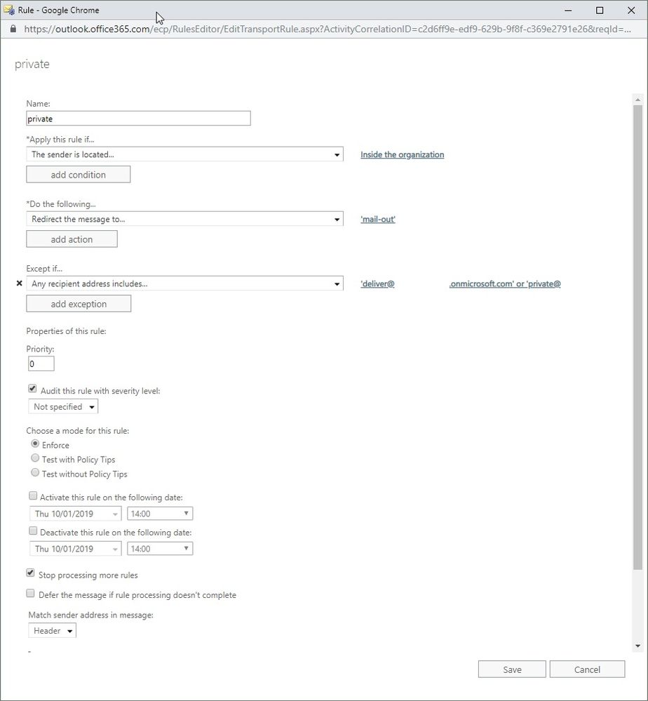 As with the other thread - BCC is a special case. One thing you can improve in the rule is to change the "match" criteria to Header or envelope, but that will hardly solve all issues. It seems to me you are trying to do something akin to journaling, although with a somewhat different purpose, which generally speaking is not a supported scenario for O365, unless you "journal" to an external mailbox.