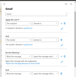 In the Except if... section, select The recipient domain is... and enter the domain you want to block the user from sending emails to like Gmail