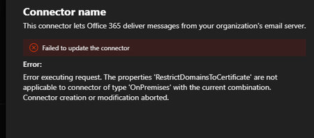 It has come to my attention that there are new limitations on Inbound on-premise connectors. Specifically, the following options are no longer available: • RequireTls • RestrictDomainsToCertificate...