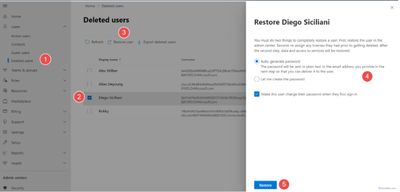 - In the left side of the admin center, , select Users > Deleted users.