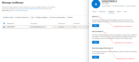 Something like:Add-ADPermission -Identity "Terry Adams" -User AaronPainter -AccessRights ExtendedRight -ExtendedRights "Send As"This example grants Send As permissions for Aaron Painter to Terry Adams's mailbox.