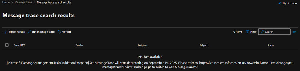 We have a tenant that didn't get upgraded to the new message trace so all EAC message traces are failing.