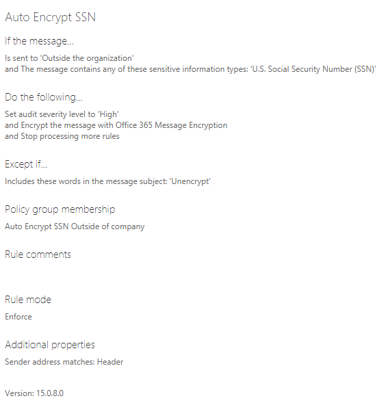 I have a Transport Rule set up to auto encrypt emails sent from our tenant to external users if they have an SSN in the body of the email or an attachment. It is hitting on some documents that do contain a pattern of SSN: xxx-xx-1234. I would like to figure out a way to exclude the document if the first 5 digits of the pattern are x's. Is this possible?