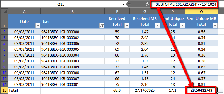 In the "Sent Unique MB Total" column total cell, add in an "AVERAGE" subtotal, then edit the formula in the cell and divide that value by the Total Row average for "Sent Unique Total", then multiply the result by 1024 – this will report the average message size in KB.