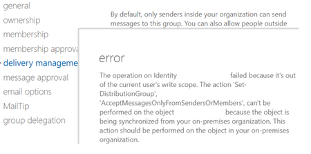 Hi All, I want to restrict who can send email to a mail enabled distribution group, but I get error when I try to add sender list. I do not have a on-premise exchange server, but i have domai...