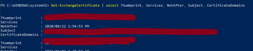Get-ExchangeCertificate |where {($_.Services -notlike "none") -and ($_.Services -notlike $null)}| select thumbprint,Services,Subject