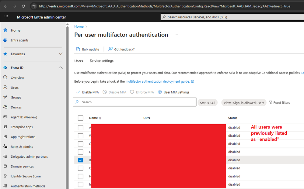 I then refreshed the page, and all users are now shown as having MFA disabled.