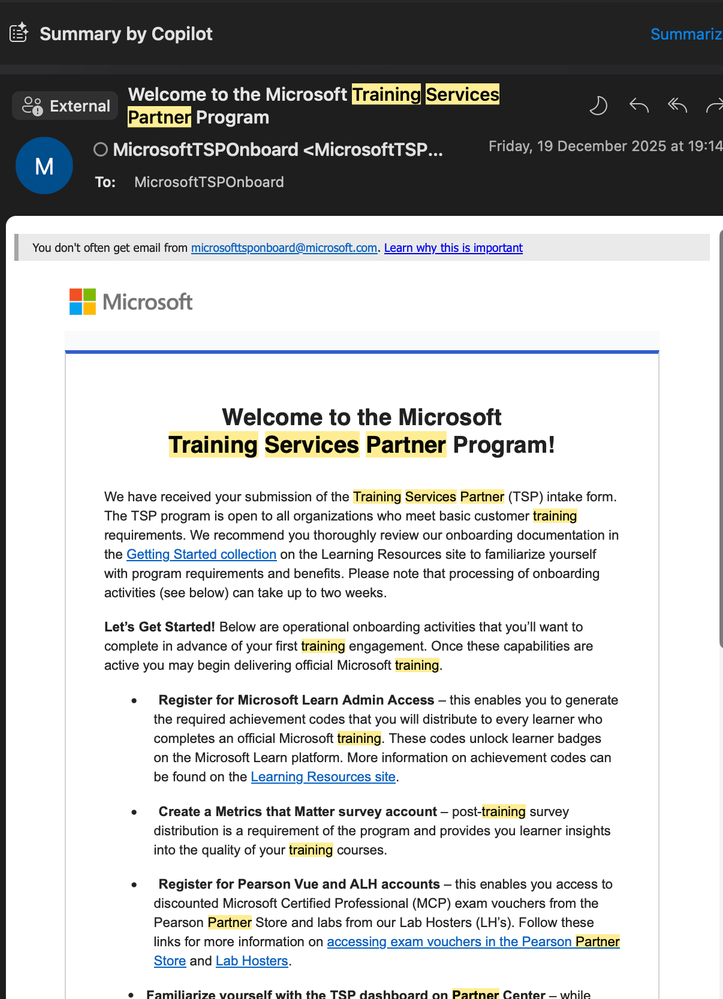 I completed the TSP onboarding form on December 19 and have been a Microsoft Certified Trainer (MCT) since early 2025. I received a confirmation email that my onboarding form was successfully submitted, but I have not yet received an email confirming that my TSP status has been granted.