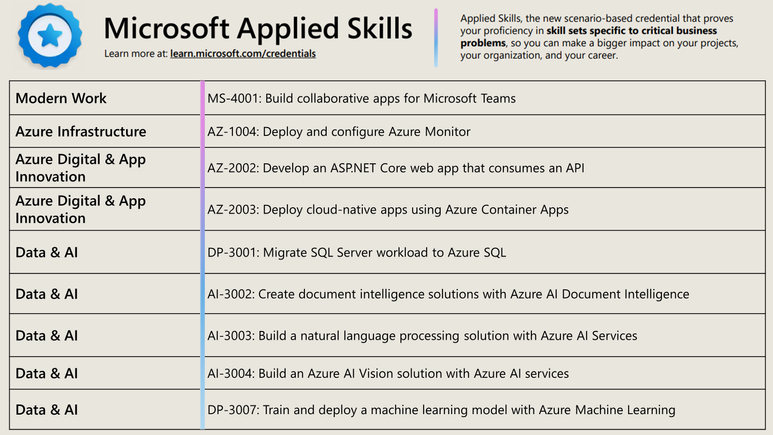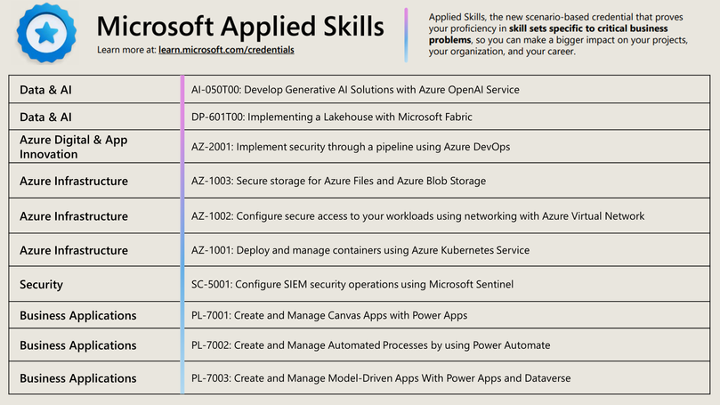 The following infographics below show our current list of Applied Skills for ILT now available! Please find attached the infographics in this post, and a few more supporting infographics.