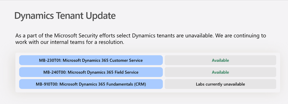 MB-230 and MB-240 are now available, but offerings differ by Lab Hoster. You'll see a post regarding this on the ILT Communications Blog very soon. We'll also update the ecosystem on this week's Community Call.