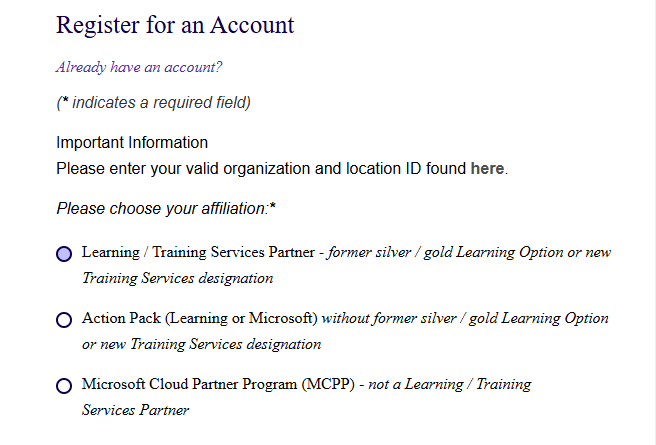 We are existing Microsoft AI Cloud Partners, and begins the onboarding for Training service partnership, which option we should select for the