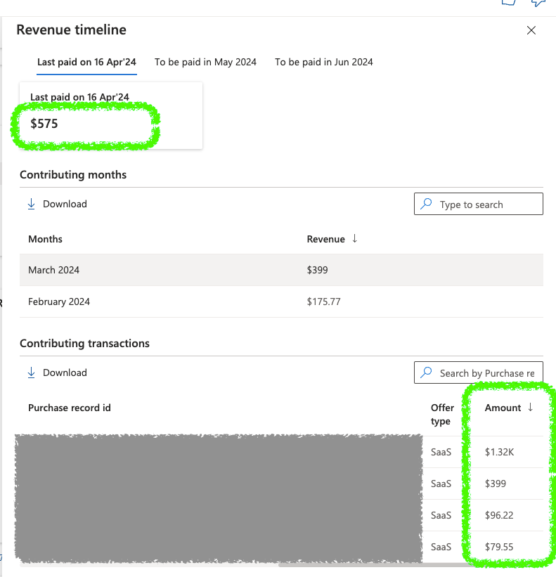In the above screenshot, the seller/ISV had clicked on the $575 payout/disbursed amount on the main page, expecting to see a breakdown of amounts that add up to $575, that's not the case with the highlighted numbers at the bottom table view.