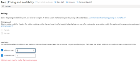 2. I'd recommend exploring the flat rate billing term by creating a new offer. Flat rate has features that give you more flexibility such as a custom meter which can be used for non-standard billing terms. For example: if you want to charge your customer for additional purchases, more users added, etc. In addition, with flat rate billing term, when you have private offer deals, you can put the total contract value instead of calculating price per User then your end customer must put the number of users when making purchases.