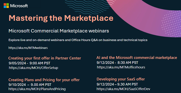▪ AI and the Microsoft commercial marketplace (9/12): Through the Microsoft commercial marketplace, get connected to the solutions you need—from innovative AI applications to cloud infra and everything in between. Join this session to learn what’s on our roadmap and see how the marketplace helps you move faster and spend smarter.