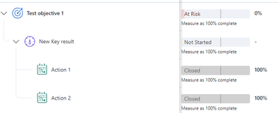 Very new to Viva Goals and have been playing around. I have 1 test objective with 1 key result and 2 actions aligned underneath. I've closed the 2 actions as 100% complete and status as closed.
