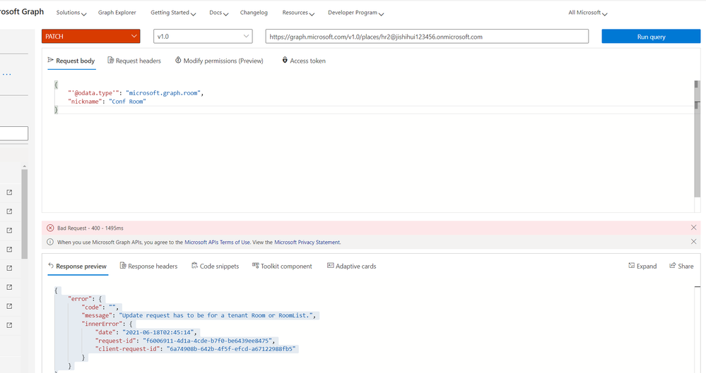 第一个问题是,我无法通过graph REST api更新会议室信息,下图是我在管理中心的会议室