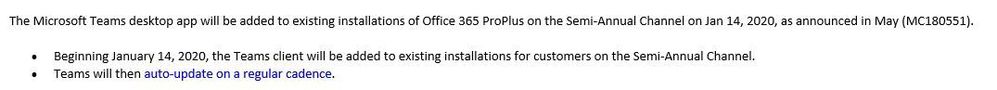 Beginning January 14, 2020, the Teams client will be added to existing installations for customers on the Semi-Annual Channel.