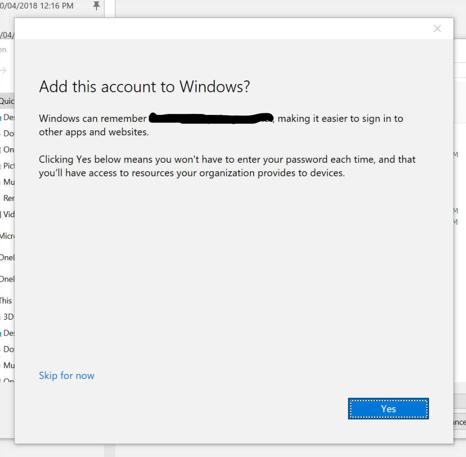 In addition to my login prompts, I get an option to "Add this account to Windows". I'm not sure what that is about, as the PC I'm on is domain joined and I'm logged on with the account. I can skip this step, so I'm not sure it is relevant to the issue. If I do try to add the account, it fails.