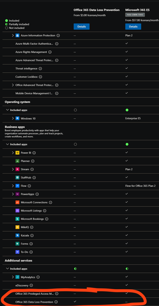 Is the functionality of the standalone Offie 365 DLP license something that is not included in the E5 license? The attached comparison from the MS365 Admin Portal would seem to indicate that it would...