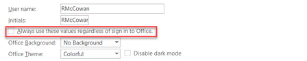 I'm trying to develop a macro that will modify the User name and enable/disable the "Always use these values regardless of sign in to Office" option from the Word Options > General > Personalize you...