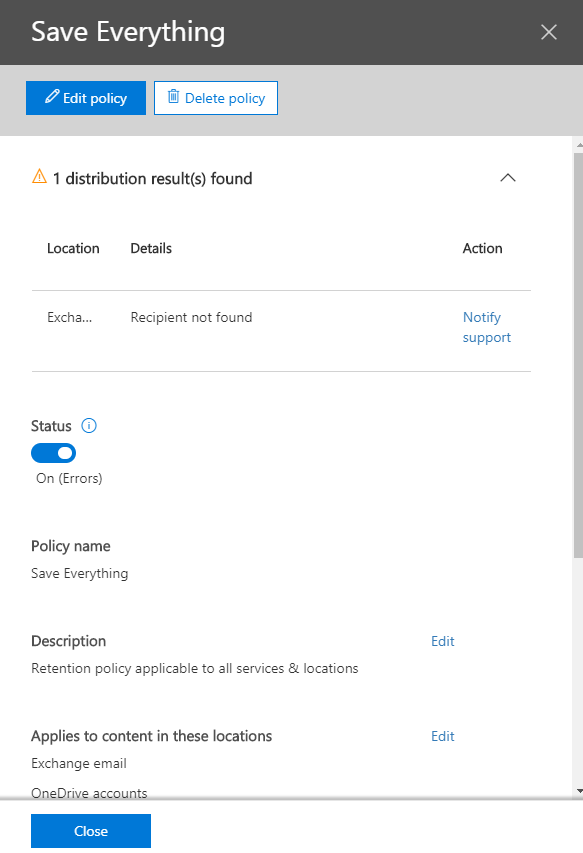 I'm trying to create a retention policy in the Security & Compliance center, but running into an error. The policy seems to create successfully, but after a while if I open the details it will show a warning sign next to '1 distribution results found'. Expanding that area, it looks like there was a problem applying the policy to exchange, with the message of "recipient not found". As you can see below, it's not terribly informative: