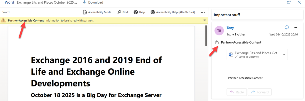 Well, a label that allows access to all authenticated users should work perfectly well with other Microsoft 365 tenants. I tested this with two different tenants by creating labels in both tenants with this access and sending email and email with protected attachments from one side to the other and vice versa. Everything worked. Here's an example of an email with a protected attachment (label is partner-accessible content) being read with OWA on the target tenant. The email has been protected as expected because of the presence of the protected attachment, and both the message and attachment content are visible using the Viewer right.