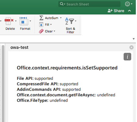 Hi, We are developing an Office add-in and face some issues when testing it on Excel for Mac. We've added the following requirements to the manifest: <Requirements>