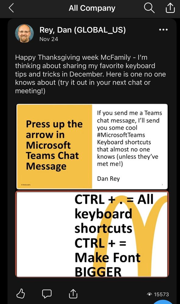 This Viva Engage post has got over 15,000 views in three weeks. I used a couple tricks to boost engagement and retention (suggested users send me a chat in Teams and then press the up arrow) and let the users discover for themselves this undocumented trick in Microsoft Teams!
