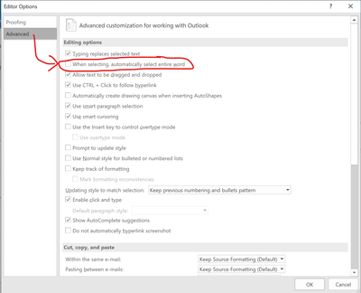 Highlighting words in Outlook. Option to not select entire word