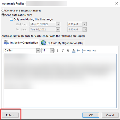 Highlighted the rules button present in the auto replies window, in the screenshot below.