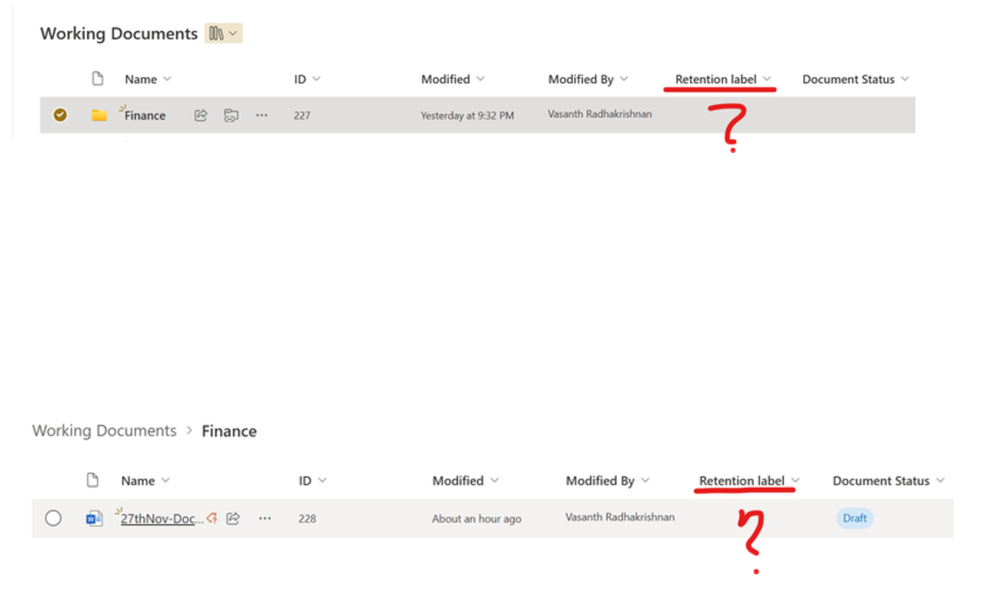 The above policy si active, but I can't see the auto label applied to the folder, or any document inside the Finance folder (See below). Is there a issue with the syntax?