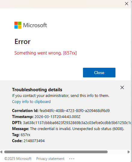 Checking here to see if someone would be able to help. I have added/deleted, restarted, logged in/out of accounts more times than I can tell you. I've tried checking the "prompt when opening" button in Control Panel, as suggested here. Nothing works. Below is a screenshot of the error message I'm getting.