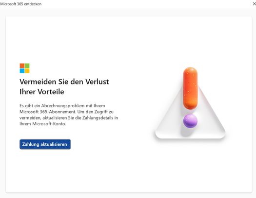 <Avoid losing benefits. There is a billing issue with your MS 365 subscription. To prevent access being denied, update your payment details in your Microsoft account.>