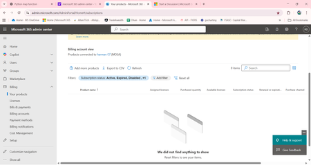 Thanks for your response. I checked all the filters, still it's not showing any licenses or products or even payment methods (which was provided at the time of subscription), except I am active user..