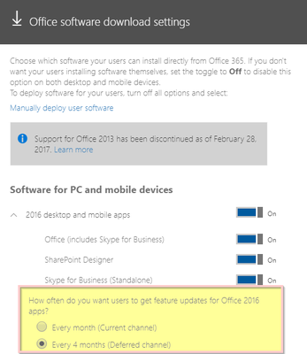 However, if a user downloads the Office client from the portal, assuming they had admin rights to install, what channel they will be put on is influenced by how the tenant is set up: