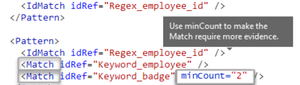 For a match element, min match count allows setting requirement to minimum number of supporting evidence to found to match pattern. As mentioned match could be a keyword list or a Regex.