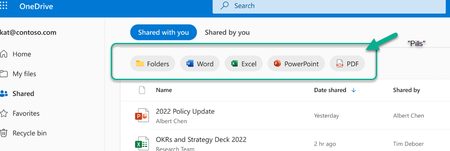 Hi! Does anyone know how to turn on the filter pills in the user's OneDrive? This was announced under Microsoft 365 Roadmap ID 117426 : "The refreshed OneDrive Shared with you view will enable users ...