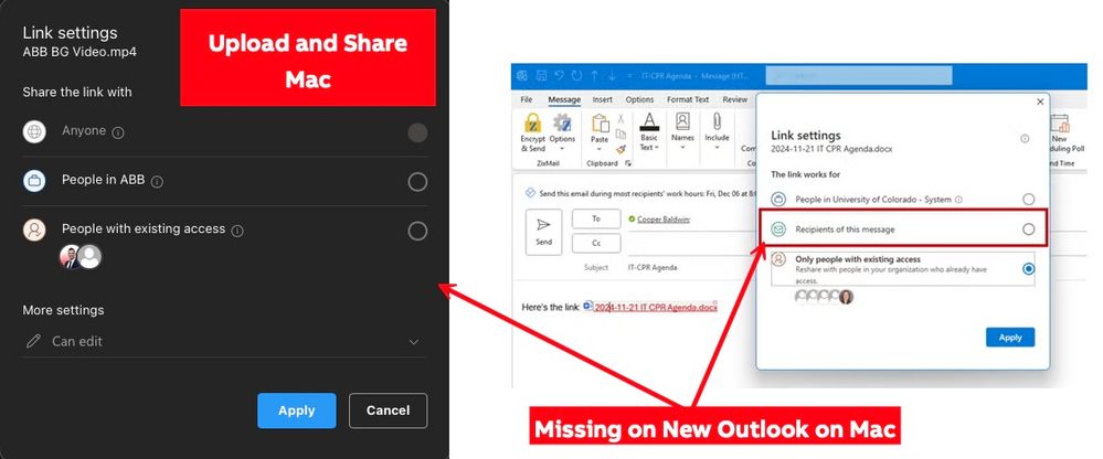 Outlook for Mac - Upload and Share is not working as access "Recipients of this message" is missing