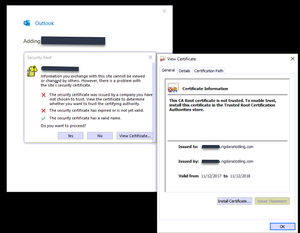 Outlook not connecting, secure certificate error
