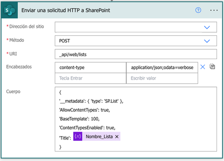 Hi everyone, I'm trying to automatically create a list through Power Automate using the "Send a HTTP Request to Sharepoint". It seems I have some problems with the headers (encabezados) or body...