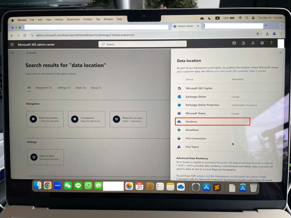 However, for OneDrive, the storage location is not specified. Why is the storage location not in Canada? I need to store my data in Canada for work-related compliance reasons.