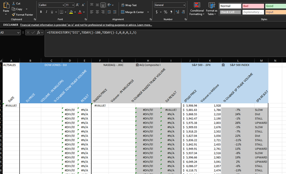 Starting around the beginning of this year the StockHistory Formula is not pulling information for both DJI and Nasdaq .IXIC. The formula still works for S&P 500.