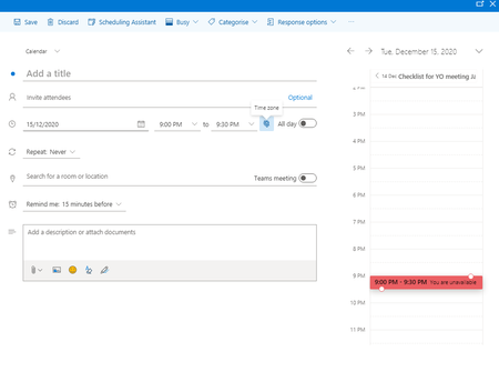 Hi there. I have been using Office 365 web version (outlook.office.365) for 5 years and I have just encountered this error an hour ago. Everytime I make a meeting invite, it does not let me tweak the...
