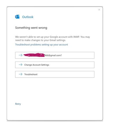Hi, I'm trying to add a Google Suite Gmail account into Office 365, but keep getting "Something went wrong" error message. So far I have closed Outlook and from Mail32 deleted and created a n...