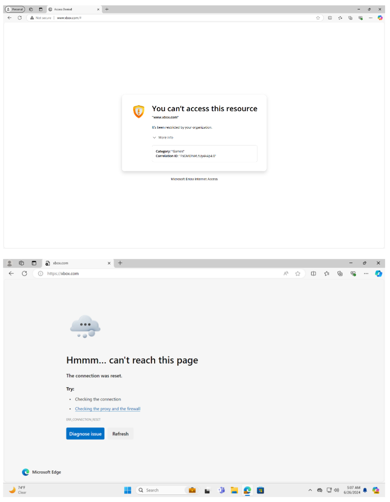 The "Hmm.. Can't reach this page." default causes confusion and doesn't give end users an idea of what to do next. The documentation for https://learn.microsoft.com/en-us/entra/global-secure-access/how-to-configure-web-content-filtering#verify-end-user-policy-enforcement shows two screenshots of a block example - one of them offers a bit more info, i.e., "You can't access this resource... it's been blocked by your organization", but it doesn't explain why or how that one shows.