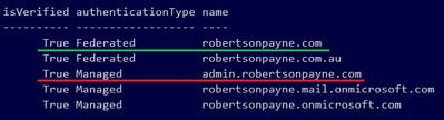 For reference, here's my list of domains, where the parent domain is underlined in green and the child I want to change is underlined in red (noting it's now showing as Managed where it was set to Federated prior.)