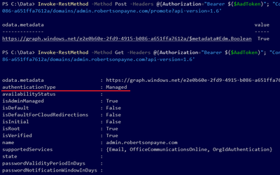 Invoke-RestMethod -Method Post -Headers @{Authorization="Bearer $($AadToken)"; "Content-Type"="application/json"} -Uri 'https://graph.windows.net/e1e1000e-2fd9-4915-b086-b123ffa4321a/domains/child.mydomain.com/promote?api-version=1.6'